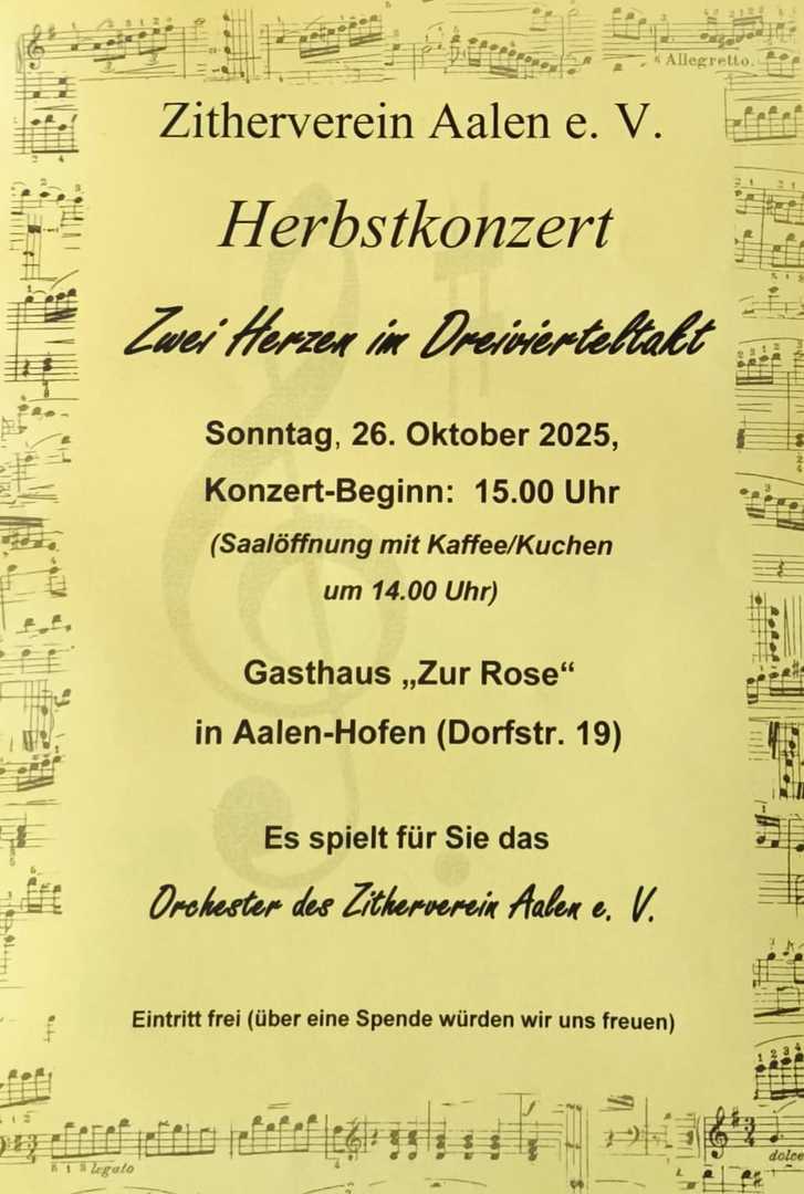 Am Sonntag, 26.10.2025 veranstaltet der Zitherverein Aalen e. V. sein beliebtes Herbstkonzert - diesmal unter dem Titel "Zwei Herzen im Dreivierteltakt".
