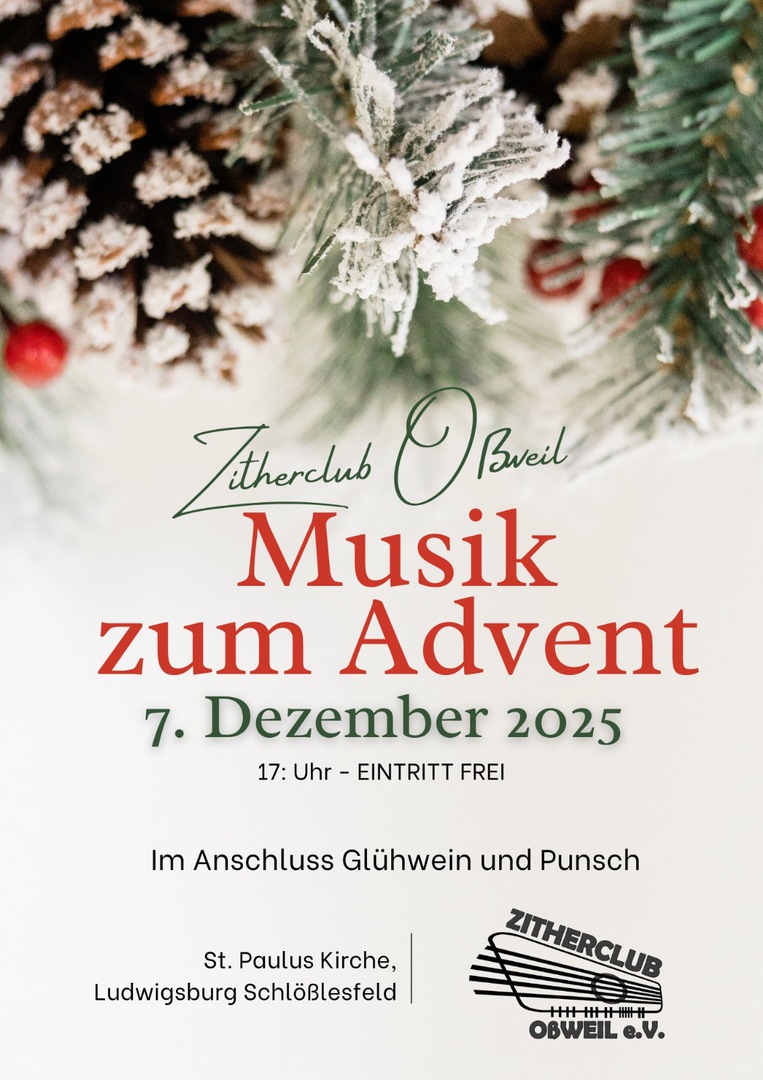 Am Sonntag, 07.12.2025 lädt der Zitherclub Oßweil e. V. herzlich zu "Musik zum Advent" ein. Im Anschluss an den musikalischen Teil wird Glühwein und Punsch angeboten.